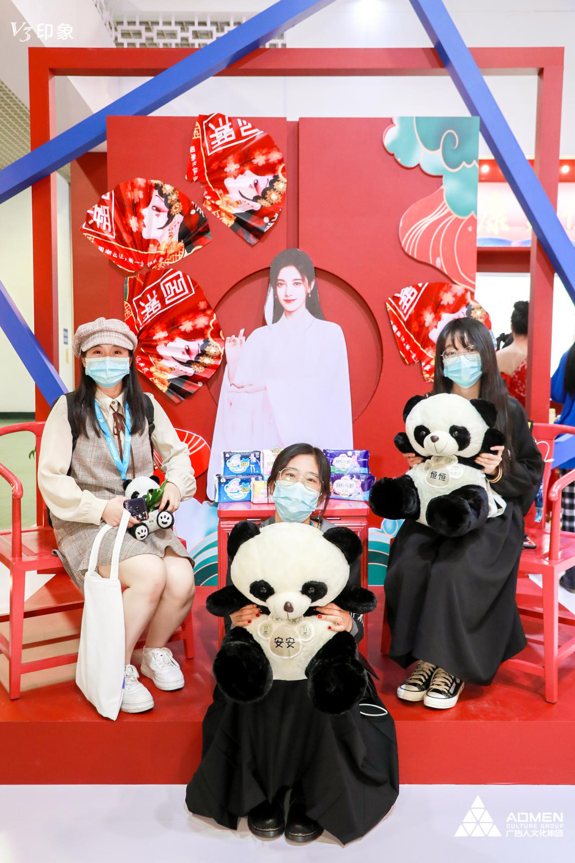 PG集团展位的正红布景极具特色,吸引了众多国风爱好者前来打卡,不少汉服小仙女都被熊猫玩偶萌翻了,纷纷合影留念。